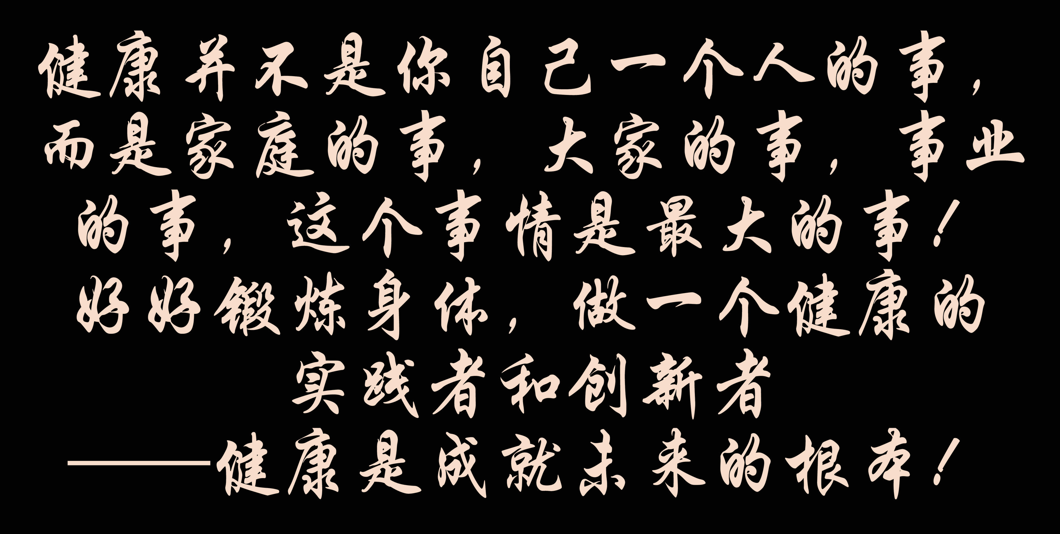 健康并不是你自己一個人的事,而是家庭的事,大家的事,事業的事,這個事情是最大的事! 好好鍛煉身體,做一個健康的實踐者和創新者——健康是成就未來的根本!
