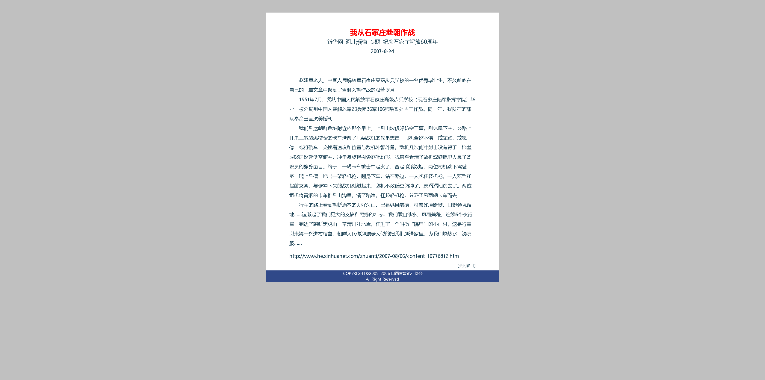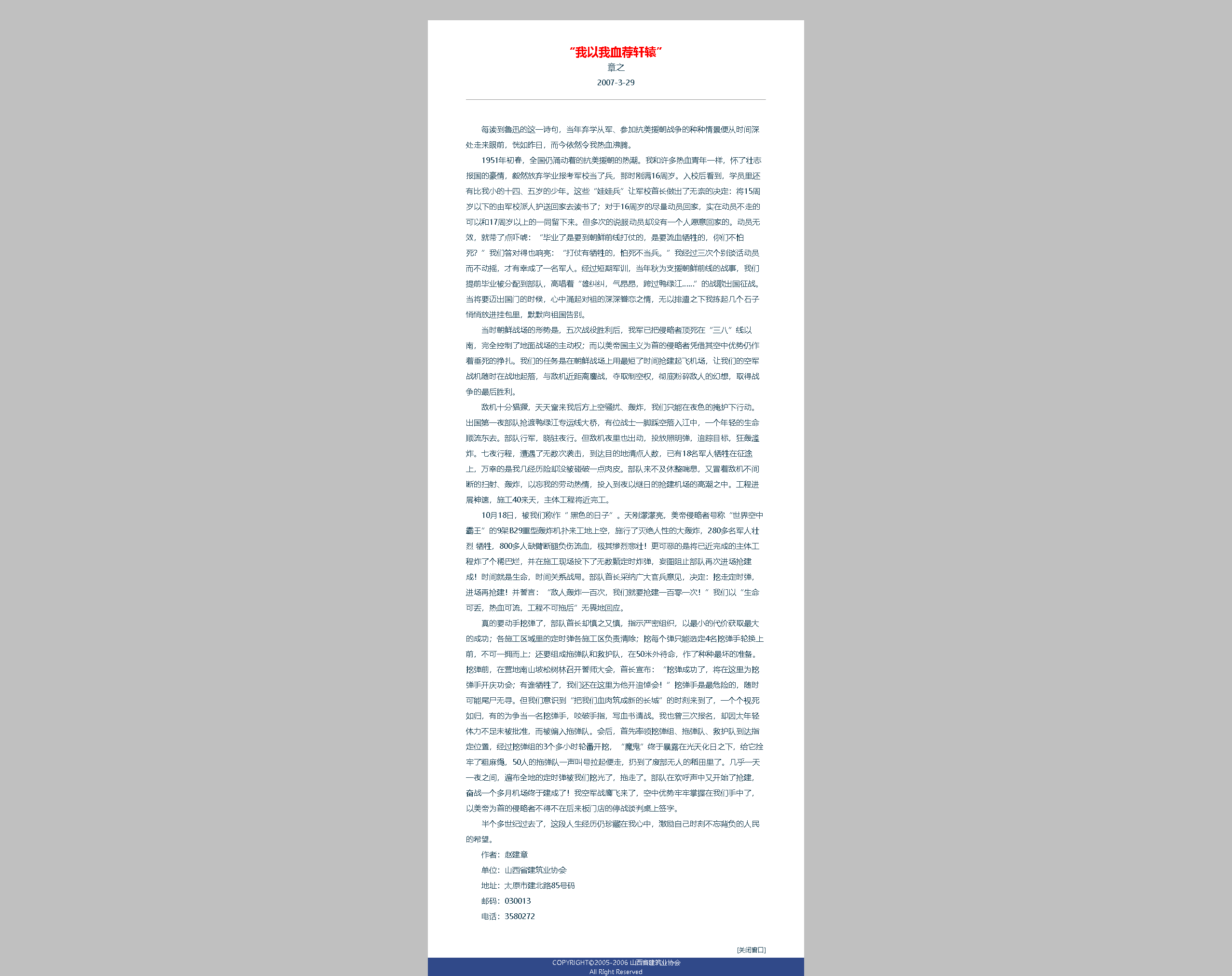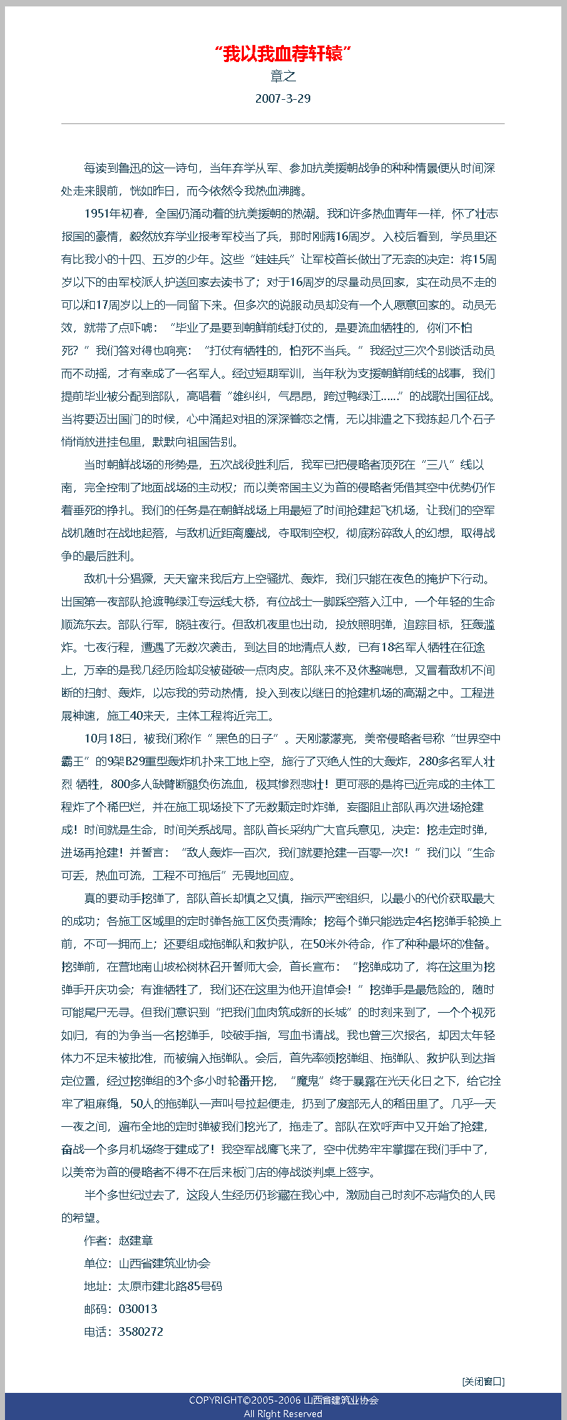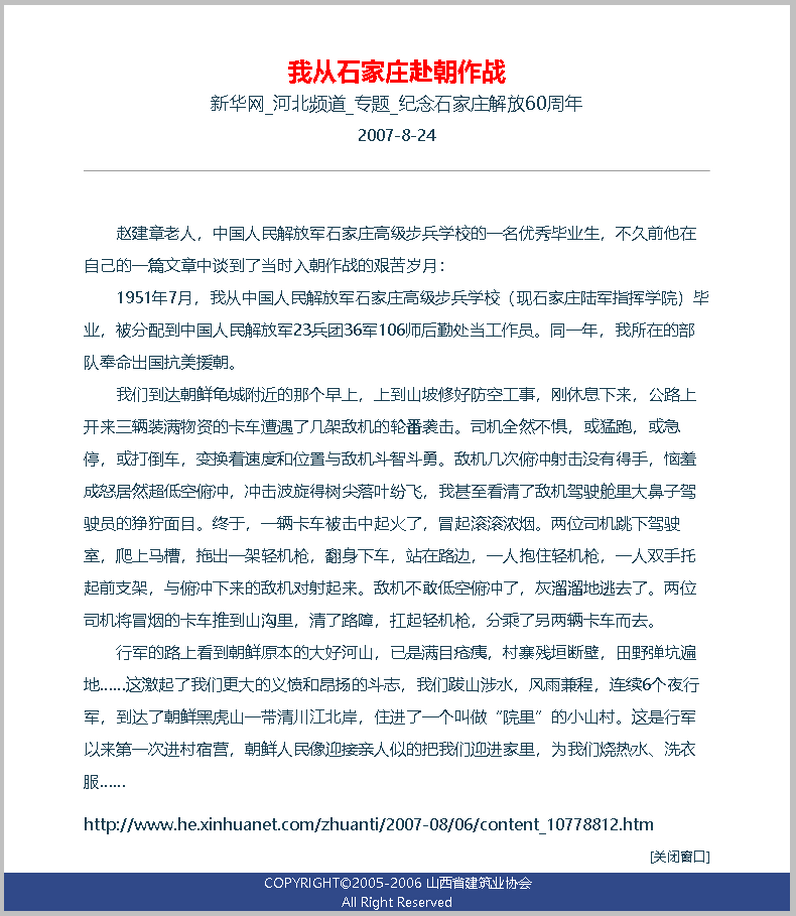 下面三篇文章,是十六年前在建筑業協會時,發表在協會網上的若干文章,證明一個抗美援朝老兵的回憶錄。