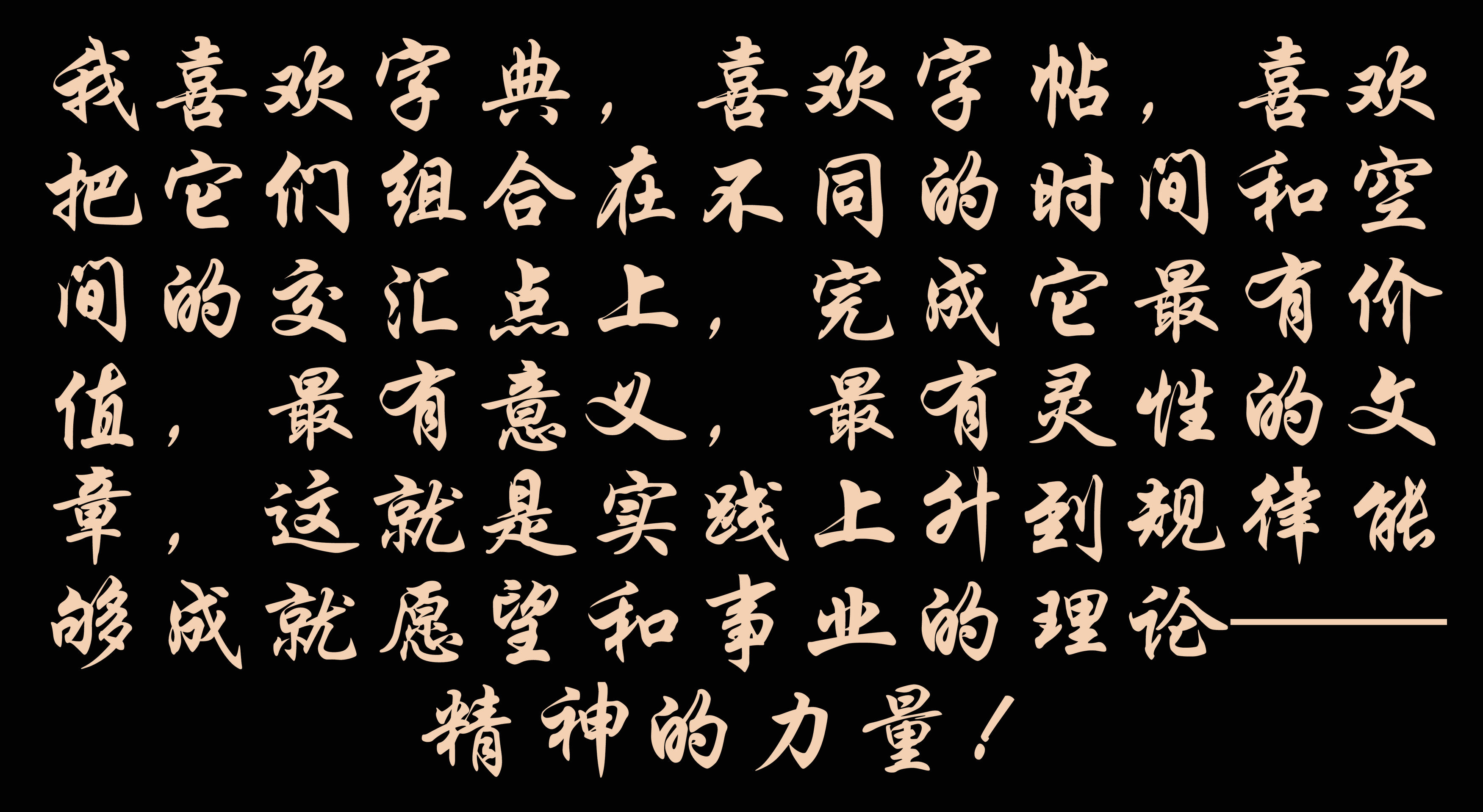 所以(yi),我喜(xi)歡(huan)字(zi)典,喜(xi)歡(huan)字(zi)帖,喜(xi)歡(huan)把它們(men)組合在(zai)不(bu)同的(de)(de)時間和空間的(de)(de)交(jiao)匯點上,完成(cheng)它最有價值,最有意義,最有靈性的(de)(de)文章,這就是實踐上升到規(gui)律能夠成(cheng)就愿望(wang)和事業的(de)(de)理論——精(jing)神的(de)(de)力量!