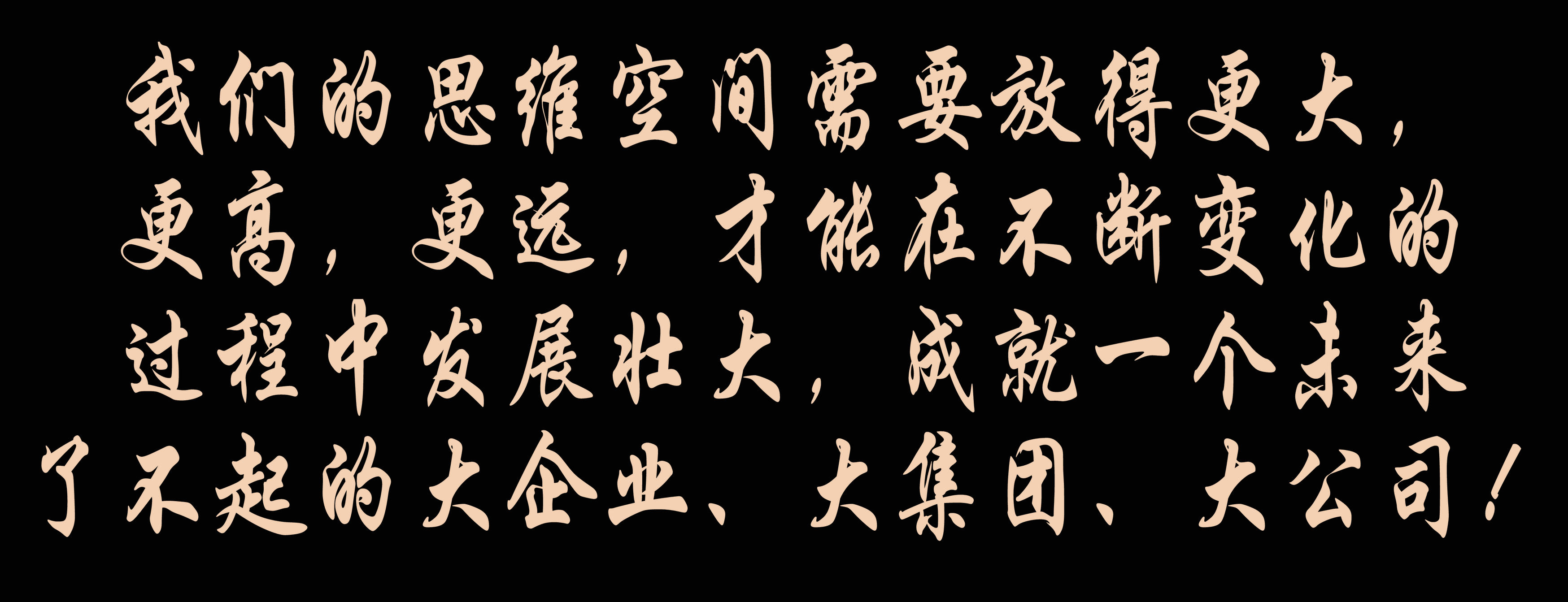 因此,我們的(de)思維空間需要(yao)放得更大(da)(da),更高,更遠,才能在不(bu)斷變化(hua)的(de)過(guo)程中發展(zhan)壯大(da)(da),成就一個(ge)未(wei)來(lai)了不(bu)起的(de)大(da)(da)企業、大(da)(da)集團、大(da)(da)公司!