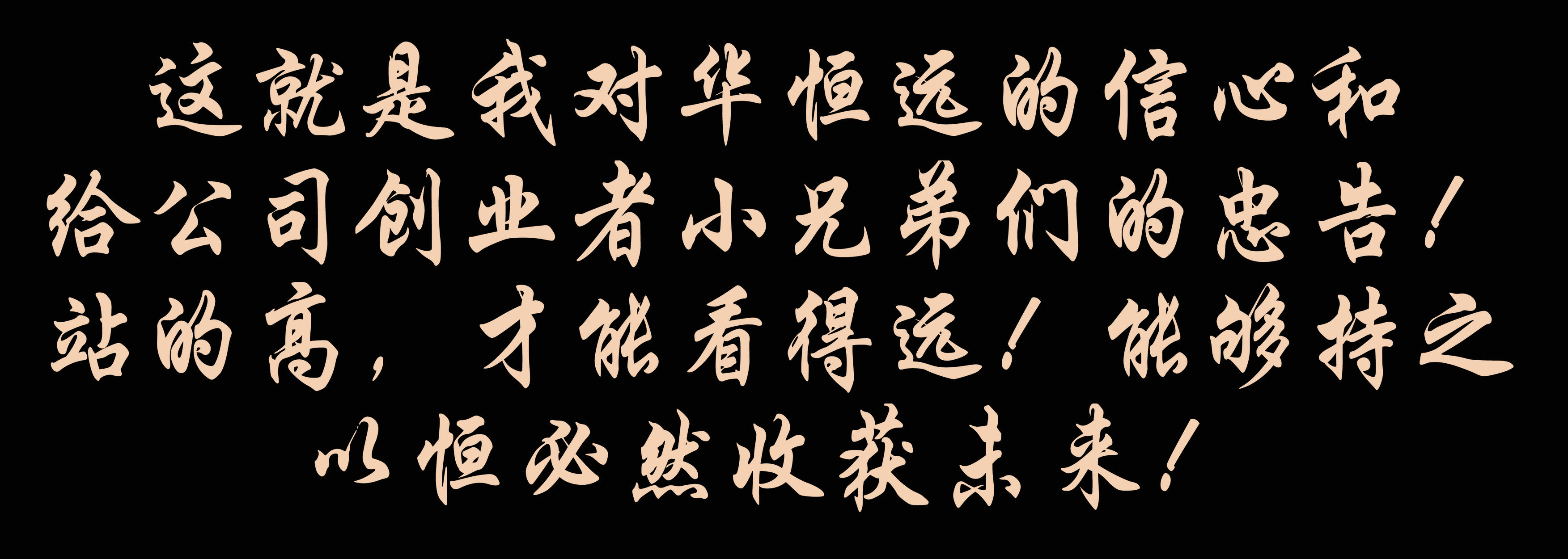 這就是我對華恒遠的信(xin)心和給公司創業者小兄弟們的忠告!站(zhan)的高(gao),才(cai)能看得遠!能夠持之(zhi)以恒必然收獲未來!