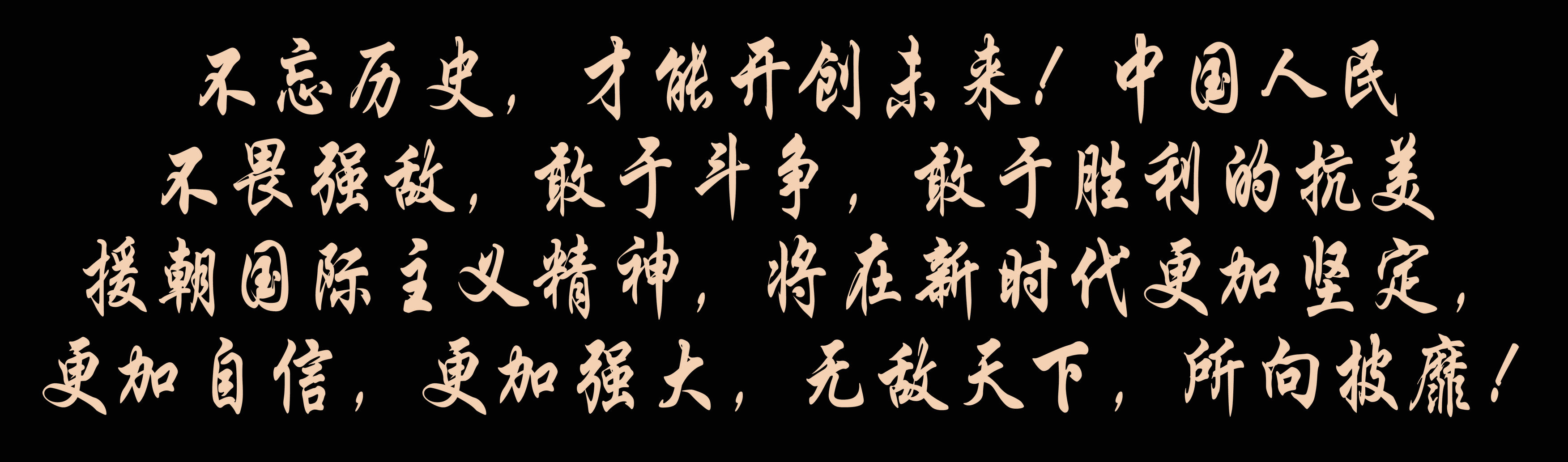 不(bu)忘歷史(shi),才能開創未來!中國(guo)人民不(bu)畏(wei)強(qiang)敵,敢于(yu)斗爭,敢于(yu)勝利的抗美(mei)援(yuan)朝國(guo)際(ji)主義(yi)精神,將在(zai)新(xin)時代(dai)更加(jia)(jia)(jia)堅(jian)定(ding),更加(jia)(jia)(jia)自信,更加(jia)(jia)(jia)強(qiang)大(da)!
