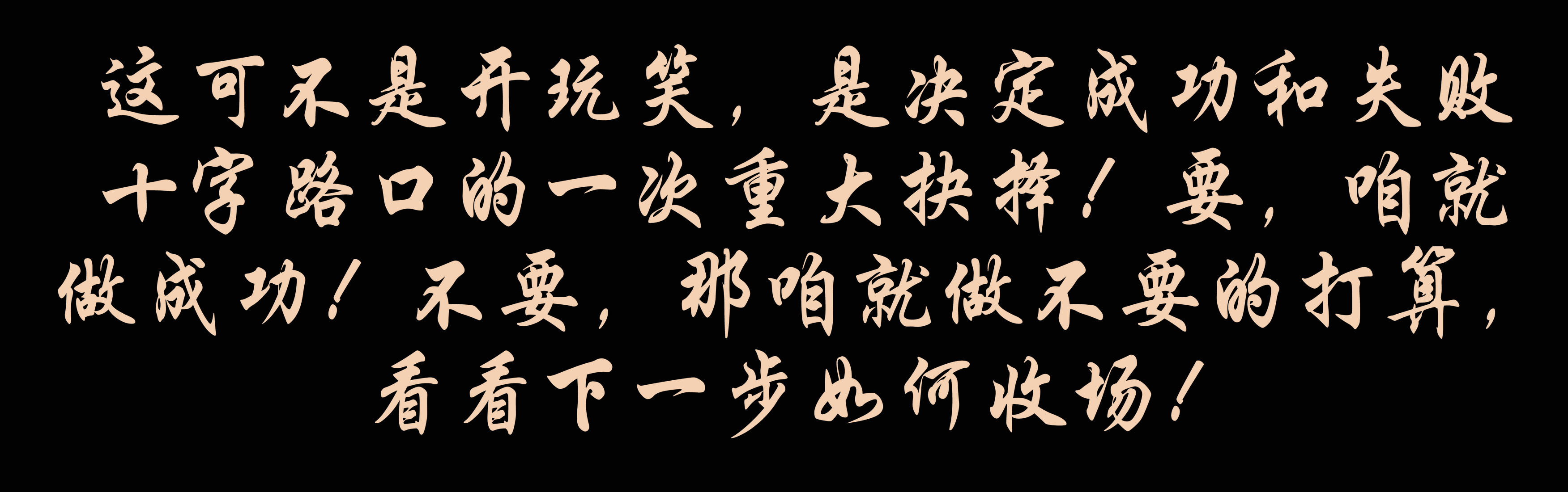 這(zhe)可(ke)不是開玩笑,是決(jue)定成功和失敗十字路(lu)口的(de)一(yi)次重大抉擇!要,咱(zan)就做(zuo)成功!不要,那(nei)咱(zan)就做(zuo)不要的(de)打算,看(kan)看(kan)下一(yi)步如何收(shou)場(chang)!