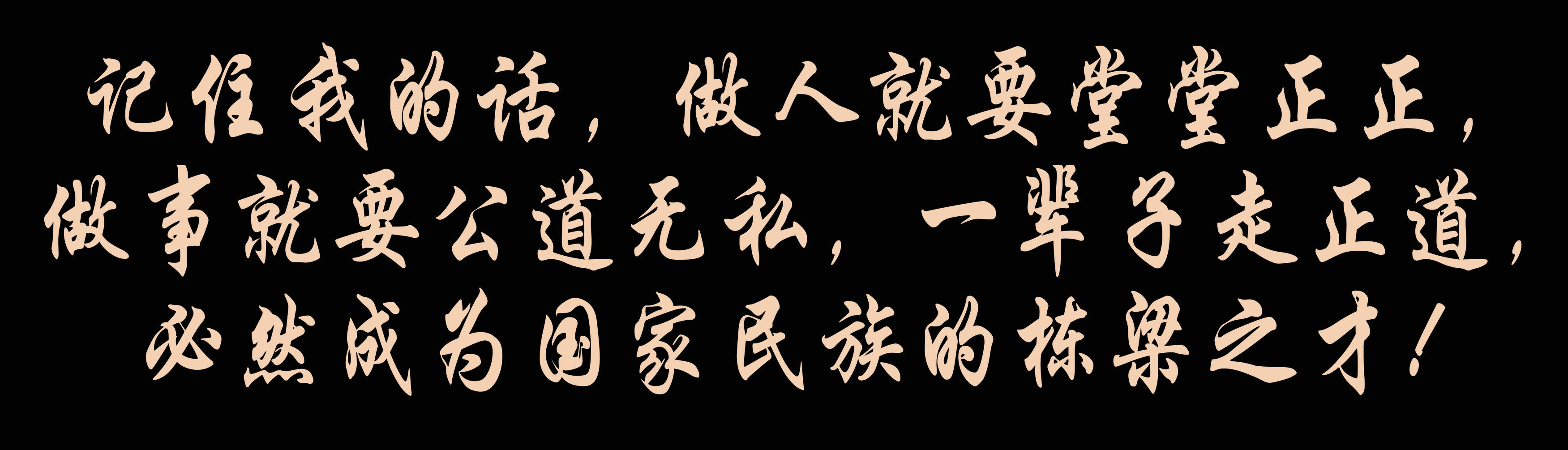 記住我(wo)的(de)話,做人就(jiu)要(yao)堂堂正正,做事就(jiu)要(yao)公道無私,一輩子走正道,必然成(cheng)為國家民(min)族的(de)棟梁之(zhi)才!