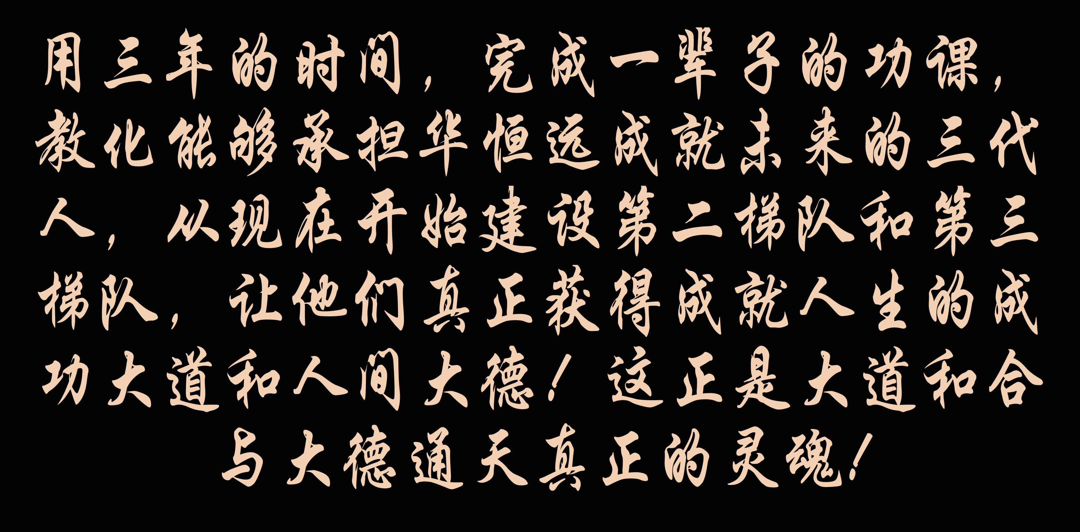 我計劃用三年(nian)的(de)時間,完成(cheng)一輩子的(de)功課,教化能夠承(cheng)擔華(hua)恒(heng)遠成(cheng)就未來的(de)三代人(ren)(ren)(ren),從現在(zai)開始建設第(di)二梯隊和第(di)三梯隊,讓他們真正(zheng)獲得成(cheng)就人(ren)(ren)(ren)生(sheng)的(de)成(cheng)功大(da)道和人(ren)(ren)(ren)間大(da)德!這正(zheng)是大(da)道和合(he)與大(da)德通天(tian)真正(zheng)的(de)靈魂!