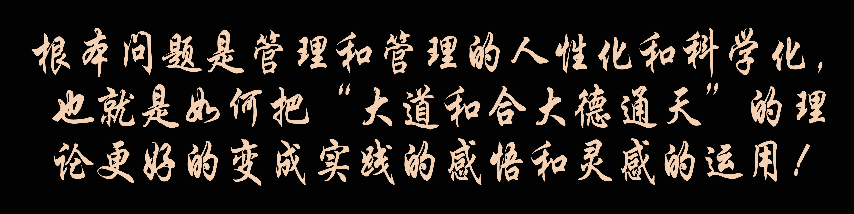 中國民(min)營企業和(he)(he)民(min)營企業家(jia)的(de)未來任何把握,可(ke)以(yi)學一學西(xi)方的(de)成(cheng)功(gong)經驗,洋(yang)為中用(yong),中西(xi)結合(he),會(hui)給我們更(geng)(geng)好的(de)感悟(wu)和(he)(he)實(shi)踐,說來說去,根本問題是管(guan)理(li)和(he)(he)管(guan)理(li)的(de)人性化(hua)和(he)(he)科學化(hua),也就是如何把“大道和(he)(he)合(he)大德通(tong)天(tian)”的(de)理(li)論更(geng)(geng)好的(de)變(bian)成(cheng)實(shi)踐的(de)感悟(wu)和(he)(he)靈感的(de)運用(yong)!