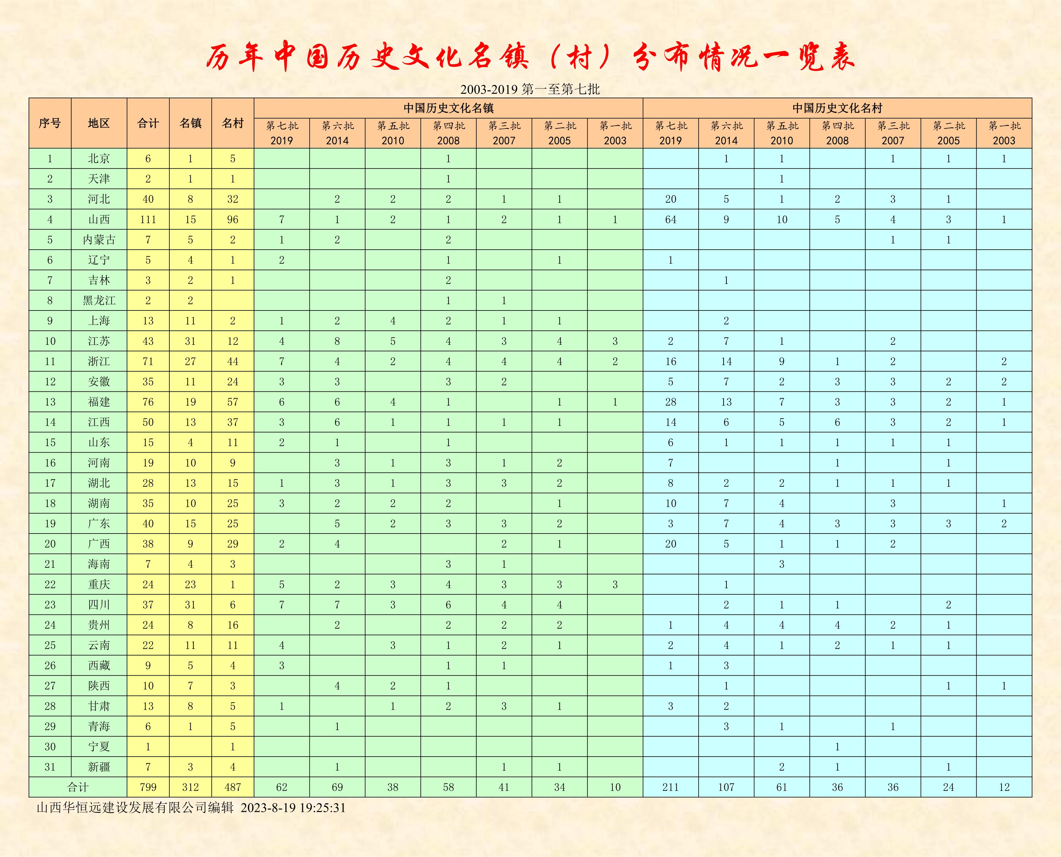 下午,完(wan)成了《全國(guo)歷史文化名(ming)鎮(村)名(ming)錄》的分布情(qing)況一覽表,山西(xi)省以111個名(ming)鎮名(ming)村,位居第一名(ming)!