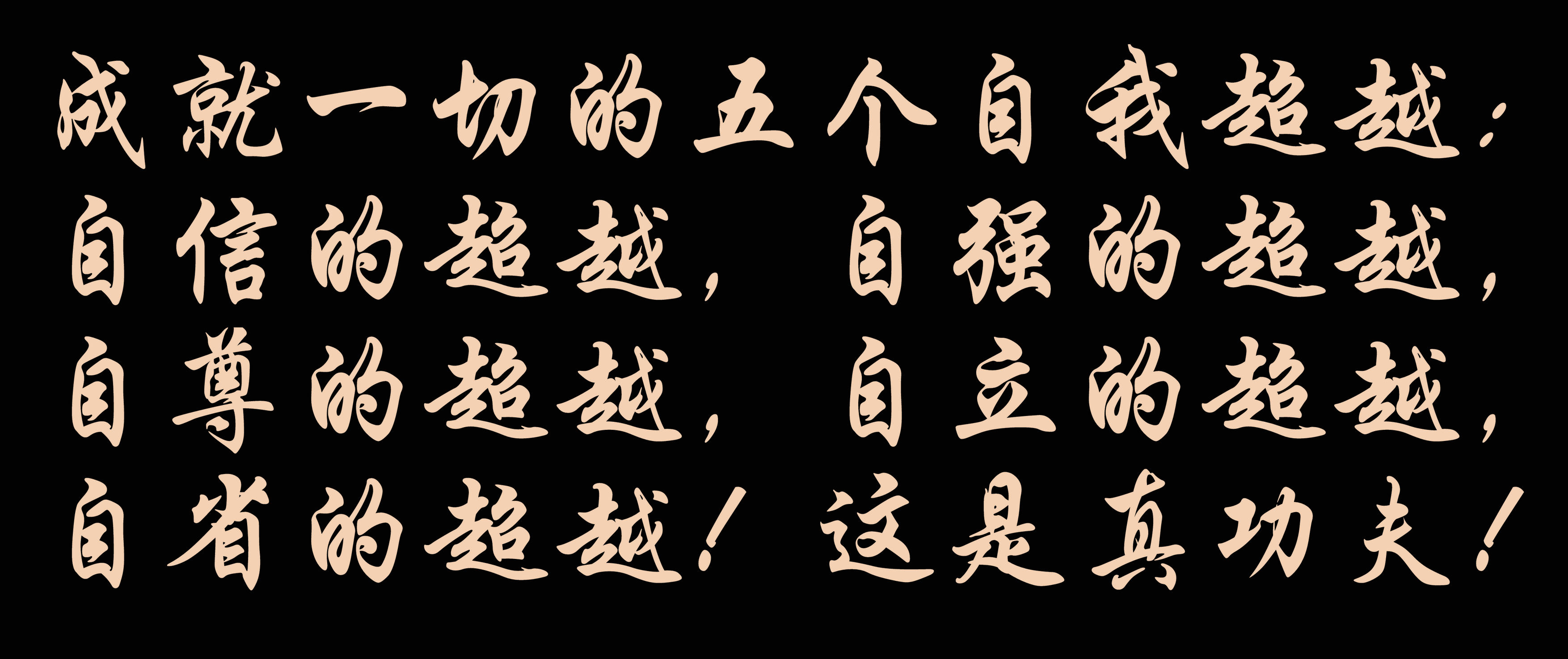 真功夫,硬功夫,在修煉,在修心,在“五不怕”,在(zai)“五不粘”!真正(zheng)做到這(zhe)些,就(jiu)有了成就(jiu)一切的五個自(zi)我超越(yue):自(zi)信的超越(yue),自(zi)強(qiang)的超越(yue),自(zi)尊的超越(yue),自(zi)立的超越(yue),自(zi)省(sheng)的超越(yue)!這(zhe)是真功夫(fu)!