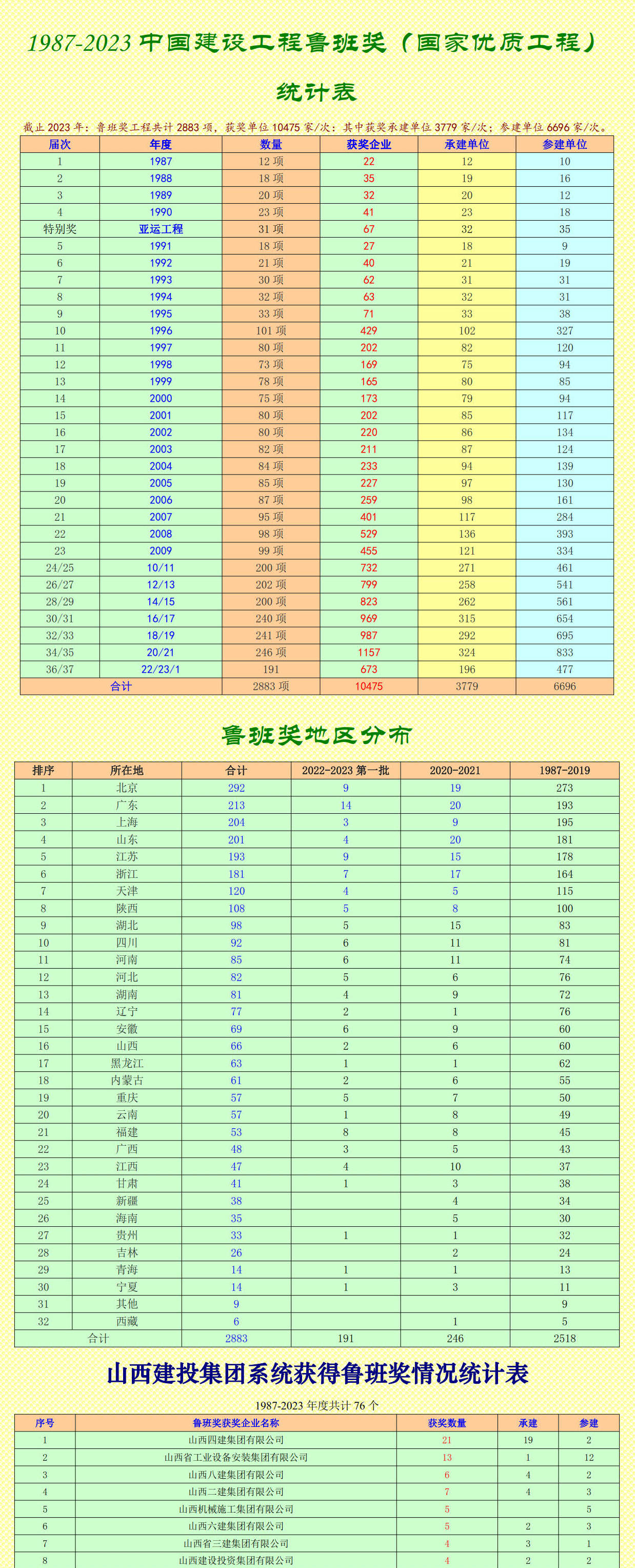 截止2023年:魯班獎工(gong)程共計2883項(xiang),獲獎單位10475家/次(ci):其中獲獎承建(jian)單位3779家/次(ci);參建(jian)單位6696家/次(ci)。