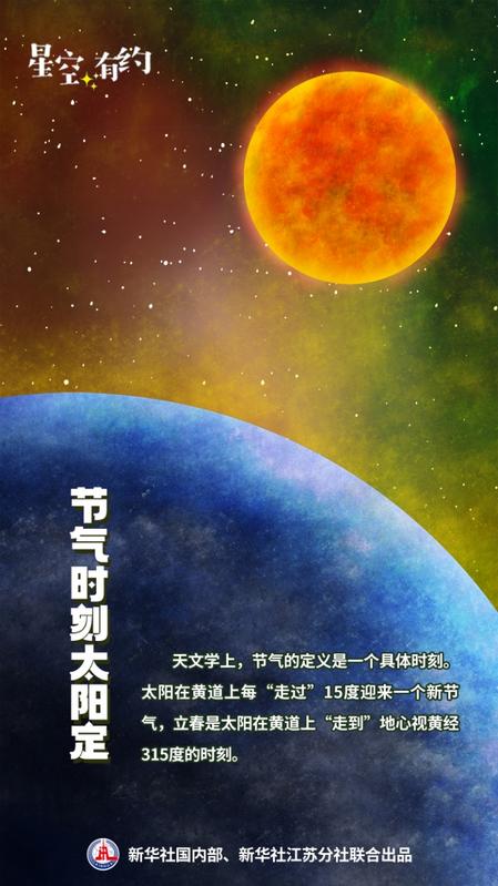 地球繞著太陽公轉,從視覺上看,地球上的人也覺得太陽在繞地球運動。天文學上把太陽在天球上的周年視運動軌跡稱為黃道。太陽沿著黃道運行一周共360度,每“走過”15度,就迎來一個新節氣。立春是太陽在黃道上“走到”地心視黃經315度的時刻。