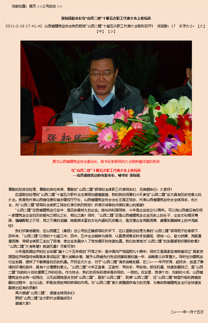 “山西二建”未來的發展,未來的前景強大!我可以告訴同志們:也是必然結果!我們今天參會的正式代表也罷,列席代表也罷,我在黨政聯席會議上,給領導同志們講的一點,個別領導同志們也講,我說經過未來三到五年的奮斗,我們要達成這樣一個目標,給二公司裝上一雙翅膀,讓二公司或者“山西二建”想往哪飛,就往哪飛!想飛多高,就飛多高!想飛多遠,就飛多遠!這就是我們“十二五規劃”的目標!這就是我們“十二五”訴求的東西!而且我前天已經講了,那個時候的到來,同樣是我們“山西二建”的必然結果!所以前兩天同樣給同志們講,2011年的職代會絕對非比尋常!2011年的職代會絕對不比前幾年的職代會!她對二公司未來幾年甚至更多年的預示非常!意義非常!必將會對未來幾年或更多年的實際成果,發展成果印證!今天我們所訴求的!今天我們規劃的!今天我們為之付出的犧牲的!