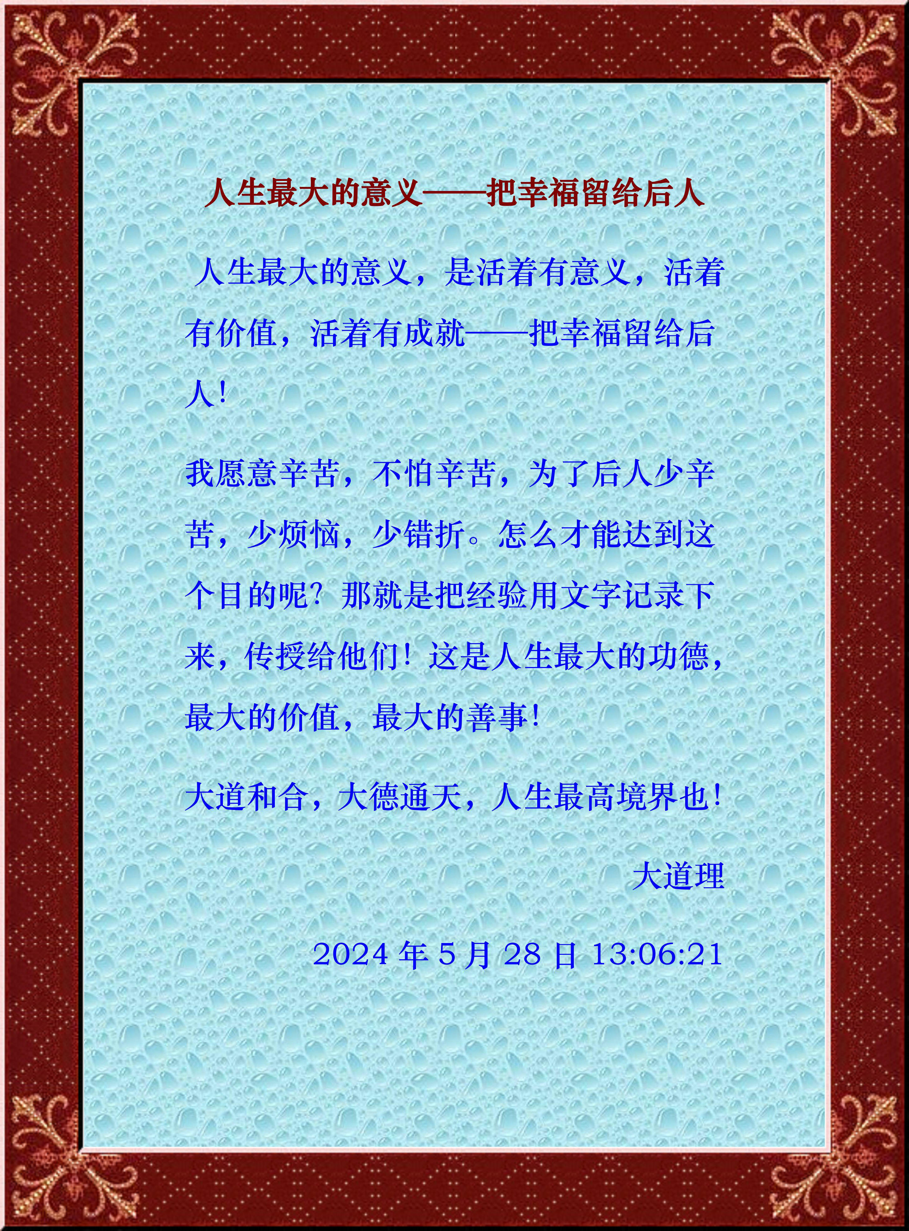 人(ren)生(sheng)最大的(de)意義,是活(huo)著(zhu)有意義,活(huo)著(zhu)有價(jia)值(zhi),活(huo)著(zhu)有成就——把(ba)幸福留(liu)給后(hou)人(ren)!