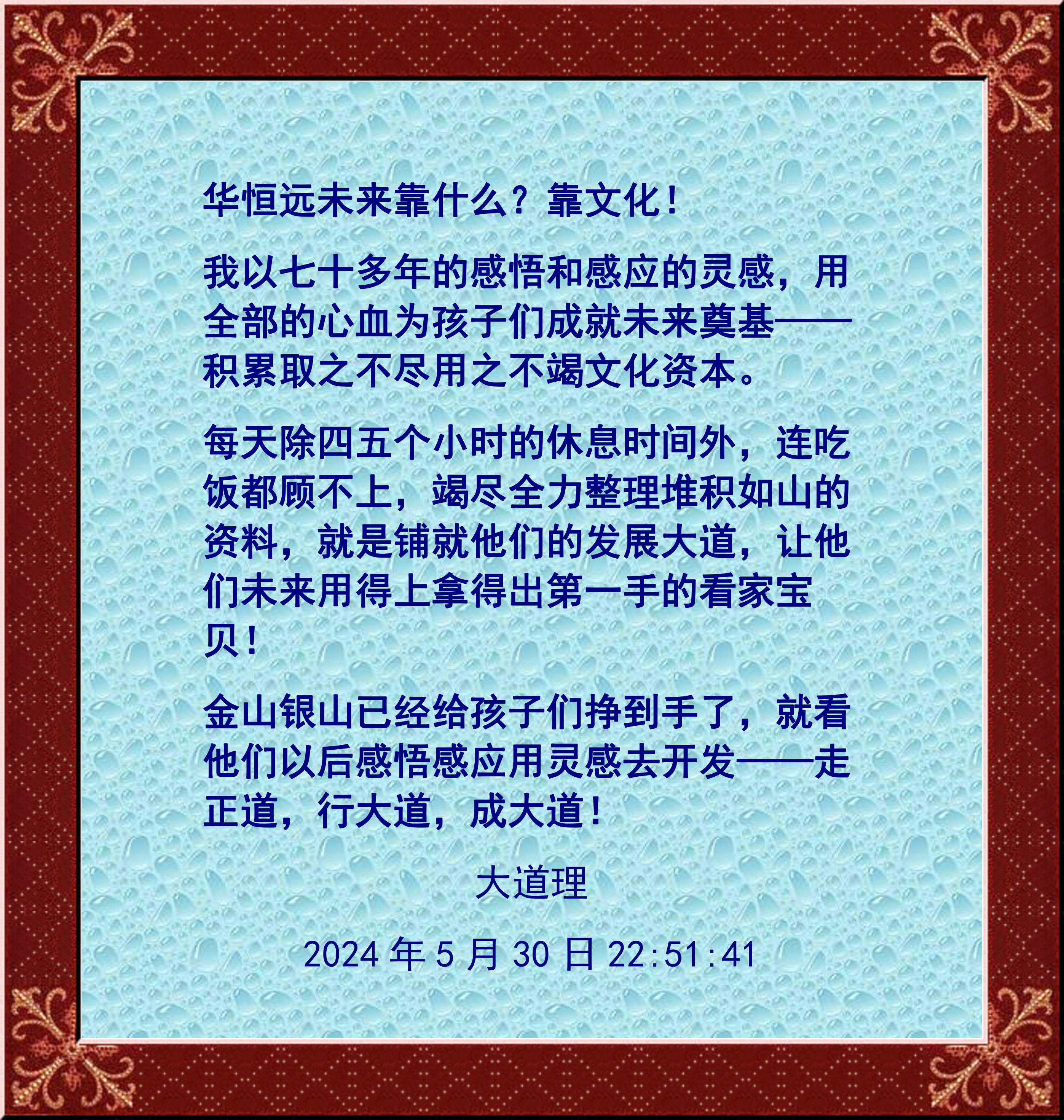 我以七十多年的(de)感悟和感應的(de)靈(ling)感,用(yong)全部的(de)心(xin)血為孩子們成就(jiu)未來(lai)奠基——積累取之(zhi)不(bu)盡用(yong)之(zhi)不(bu)竭文化資本。