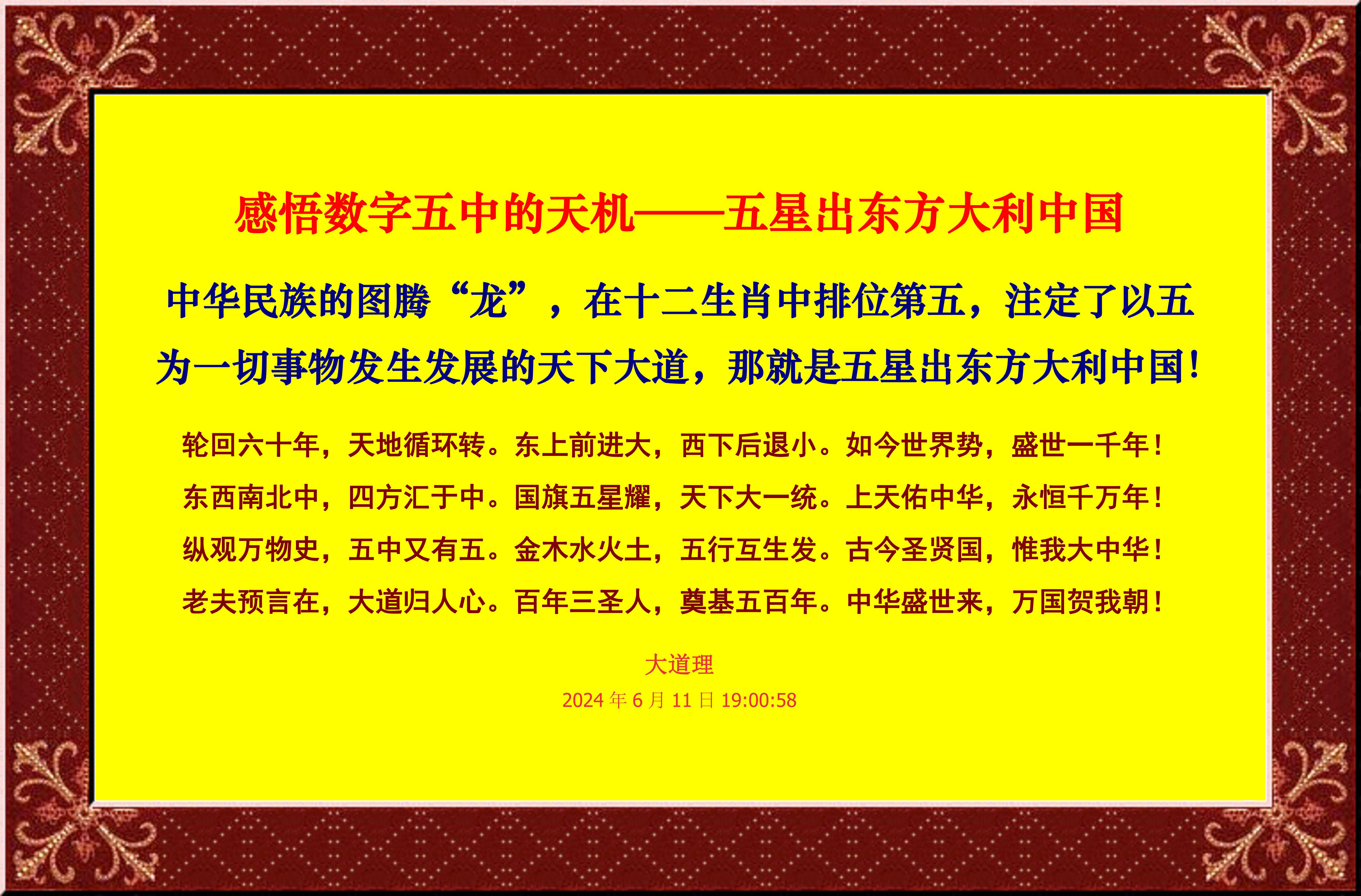 在(zai)十二生(sheng)肖中(zhong)排(pai)位第五,注定了以五為一切事物發生(sheng)發展的(de)天(tian)下大(da)道,那就是(shi)五星出東方大(da)利中(zhong)國!