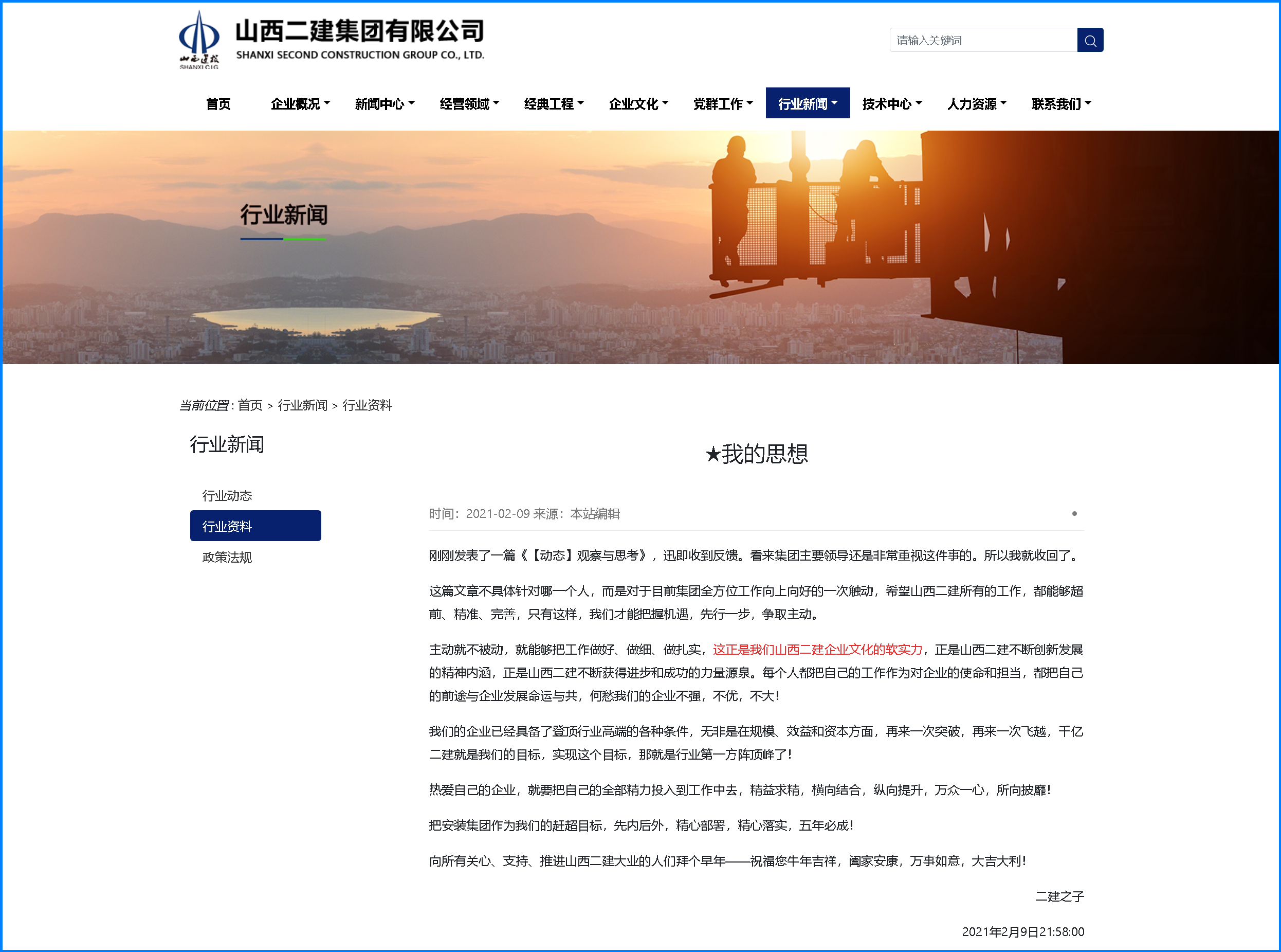 主動就不被動,就能夠把工作做好、做細、做扎實,這正是我們山西二建企業文化的軟實力,正是山西二建不斷創新發展的精神內涵,正是山西二建不斷獲得進步和成功的力量源泉。每個人都把自己的工作作為對企業的使命和擔當,都把自己的前途與企業發展命運與共,何愁我們的企業不強,不優,不大!